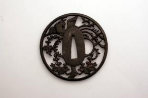 Elsa di spada giapponese di forma tonda e bordo leggermente rialzato, con i tre fori canonici, quello centrale (nakagoana) per il codolo, il foro di sinistra (kozuka hitsuana) per il coltellino, e quello di destra (kogai hitsuana) per lo spillone. E' rappresentata una fenice sotto un ramo di kiri (paulonia).