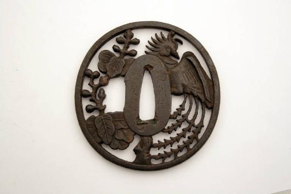 - NOTIZIE STORICO CRITICHE In Giappone l'elsa è detta "tsuba". La sua funzione primaria è quella di fare in modo che la mano di chi impugna la spada non finisca sulla propria lama, oltre a bilanciare la spada e a proteggere la mano dalla lama dell'avversario.\nIndirettamente, gli tsuba servivano anche a mostrare lo stato sociale e il gusto personale e, come per altri oggetti d'uso, divennero presto un mezzo d'espressione artistica.\nDal XIX secolo, quando la spada e i suoi accessori divennero più decorativi che funzionali, e ancor più dal 1878, a seguito della proibizione di portare la spada, gli tsuba erano prodotti come oggetti da collezione favoriti dagli occidentali, che li vedevano come una originale e nuova forma d'arte. Molti di questi oggetti raggiunsero infatti l'Europa già nell'Ottocento.\n\nL'uccello "hoo" è convenzionalmente definito "fenice". SI tratta di una definizione di comodo, contestata però da alcuni autori. Le piume di questo uccello, sono dipinte in cinque colori diversi che rappresentano le cinque virtù traducibili grossolanamente in umanità, decenza, saggezza, fedeltà e amore. Quando è rappresentato insieme al ramo di Kiri, simboleggia l'autorità imperiale giapponese.