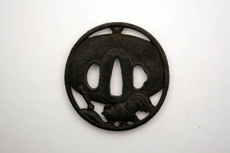 - NOTIZIE STORICO CRITICHE In Giappone l'elsa è detta "tsuba". La sua funzione primaria è quella di fare in modo che la mano di chi impugna la spada non finisca sulla propria lama, oltre a bilanciare la spada e a proteggere la mano dalla lama dell'avversario.\nIndirettamente, gli tsuba servivano anche a mostrare lo stato sociale e il gusto personale e, come per altri oggetti d'uso, divennero presto un mezzo d'espressione artistica.\nDal XIX secolo, quando la spada e i suoi accessori divennero più decorativi che funzionali, e ancor più dal 1878, a seguito della proibizione di portare la spada, gli tsuba erano prodotti come oggetti da collezione favoriti dagli occidentali, che li vedevano come una originale e nuova forma d'arte. Molti di questi oggetti raggiunsero infatti l'Europa già nell'Ottocento.\n\nIn Cina il gallo, decimo animale dello Zodiaco, simboleggia le Cinque Virtù confuciane (benevolenza, purezza, buone maniere, saggezza, verità) ed il principio maschile yang. In Giappone viene spesso rappresentato con il tamburo da guerra, immagine di pace.