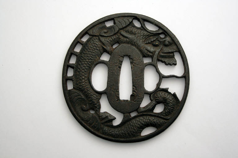 - NOTIZIE STORICO CRITICHE In Giappone l'elsa è detta "tsuba". La sua funzione primaria è quella di fare in modo che la mano di chi impugna la spada non finisca sulla propria lama, oltre a bilanciare la spada e a proteggere la mano dalla lama dell'avversario.\nIndirettamente, gli tsuba servivano anche a mostrare lo stato sociale e il gusto personale e, come per altri oggetti d'uso, divennero presto un mezzo d'espressione artistica.\nDal XIX secolo, quando la spada e i suoi accessori divennero più decorativi che funzionali, e ancor più dal 1878, a seguito della proibizione di portare la spada, gli tsuba erano prodotti come oggetti da collezione favoriti dagli occidentali, che li vedevano come una originale e nuova forma d'arte. Molti di questi oggetti raggiunsero infatti l'Europa già nell'Ottocento.\n\nI fori laterali, hitsuana servivano a lasciare passare i manici dei piccoli oggetti decorativi e d'uso che sporgevano dal fodero.\n\nAnche in Giappone, come in Cina, il drago è uno dei soggetti artistici più rappresentati. La figura del drago permea infatti le religioni, il folclore, l'arte e la cultura in generale dei paesi dell'Asia Orientale che hanno avuto la Cina come riferimento culturale. La sua simbologia, è perciò complessa e i significati ad essa legata sono molteplici, ma sempre positivi. In particolare il drago è portatore di ricchezza e fortuna ed è associato all'acqua in quanto abitante dei mari e dei cieli. Secondo la tradizione cinese, infatti, il drago, inseguendo la perla (il tuono) fra le nuvole causa le piogge, necessarie al buon raccolto.