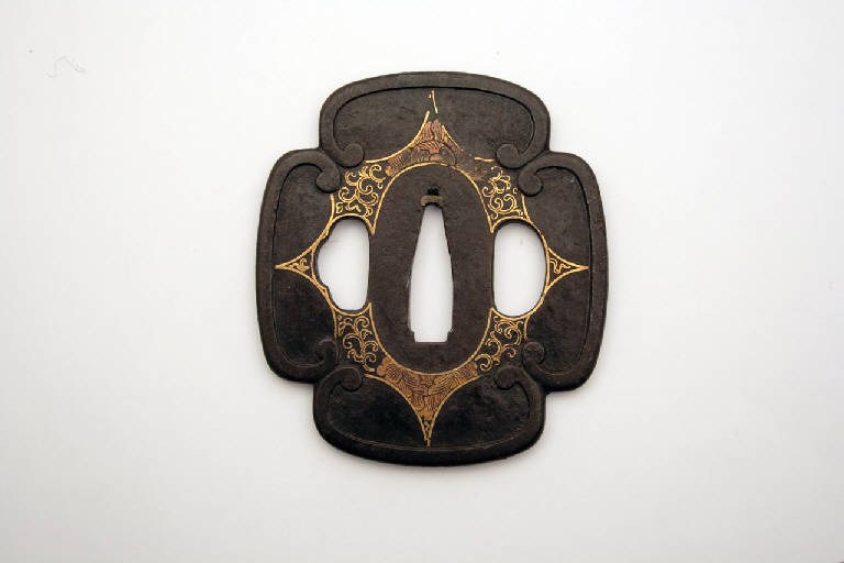 Elsa di spada giapponese di forma quadrilobata (mokkogata), con i tre fori canonici, quello centrale (nakagoana) per il codolo, il foro di sinistra (kozuka hitsuana) per il coltellino, e quello di destra (kogai hitsuana) per lo spillone. E' rappresentato un motivo floreale e la foglia di pawlonia.