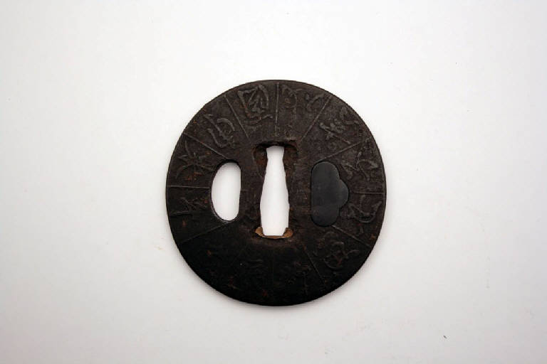 Elsa di spada giapponese di forma leggermente ovale, con i tre fori canonici, quello centrale (nakagoana) per il codolo, il foro di sinistra (kozuka hitsuana) per il coltellino, e quello di destra (kogai hitsuana) per lo spillone. Quest'ultimo è stato riempito con una piastrina di ottone patinato, shakudo. Sono rappresentati dodici caratteri giapponesi in rilievo. ($$$)
