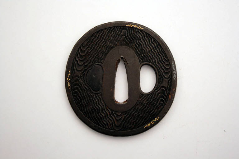 Elsa di spada giapponese in ferro, di forma tonda, con i tre fori canonici, quello centrale (nakagoana) per il codolo, il foro di sinistra (kozuka hitsuana) per il coltellino, e quello di destra (kogai hitsuana) per lo spillone. Quest'ultimo è stato riempito con una piastrina di ottone patinato, shakudo. La superficie è bulinata a imitazione delle venature del legno.