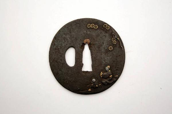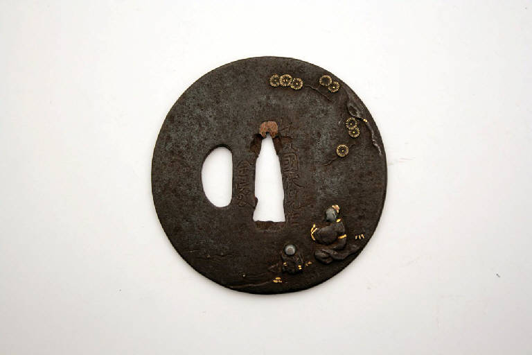 Elsa di spada giapponese di forma tonda. Sono presenti il foro centrale per il codolo (nakagoana) e il foro di sinistra (kozuka hitsuana). La decorazione è stata realizzata con intarsi in oro e argento e rappresenta due personaggi sotto un albero di pino, presso un corso d'acqua, e al verso un paesaggio con montagne in lontananza, un albero e un pescatore sulla sua barca.