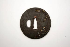 - NOTIZIE STORICO CRITICHE In Giappone l'elsa è detta "tsuba". La sua funzione primaria è quella di fare in modo che la mano di chi impugna la spada non finisca sulla propria lama, oltre a bilanciare la spada e a proteggere la mano dalla lama dell'avversario.\nIndirettamente, gli tsuba servivano anche a mostrare lo stato sociale e il gusto personale e, come per altri oggetti d'uso, divennero presto un mezzo d'espressione artistica.\nDal XIX secolo, quando la spada e i suoi accessori divennero più decorativi che funzionali, e ancor più dal 1878, a seguito della proibizione di portare la spada, gli tsuba erano prodotti come oggetti da collezione favoriti dagli occidentali, che li vedevano come una originale e nuova forma d'arte. Molti di questi oggetti raggiunsero infatti l'Europa già nell'Ottocento.\n\nDegli spessori di rame sono stati applicati ai vertici del nakagoana per fermare perfettamente l'elsa sulla lama.\n\nLa prima generazione di artisti Kaneiye, chiamati Shodai, nasce alla fine del XVI secolo, la seconda tra 1600 ed il 1650, mentre la terza dalla metà alla fine del XVII secolo. Queste tre generazioni hanno vissuto nel periodo in cui naque il Buddhismo Zen. L'arte Zen giapponese viene influenzata dalla pittura Cinese delle dinastie Song, Yuan e Ming. Molto spesso vengono rappresentati paesaggi sperduti, saggi e temi religiosi. Questa tsuba, anche se firmata Yamashiro Kuni Fushimi Ju Kaneiye (Kaneiye che visse a Fushimi in Yamashiro), non ha le caratteristiche tipiche delle tre generazione. Potrebbe, perciò, trattarsi di una copia prodotta nel XVIII secolo.