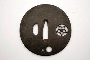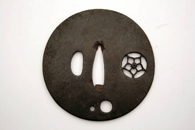 - NOTIZIE STORICO CRITICHE In Giappone l'elsa è detta "tsuba". La sua funzione primaria è quella di fare in modo che la mano di chi impugna la spada non finisca sulla propria lama, oltre a bilanciare la spada e a proteggere la mano dalla lama dell'avversario.\nIndirettamente, gli tsuba servivano anche a mostrare lo stato sociale e il gusto personale e, come per altri oggetti d'uso, divennero presto un mezzo d'espressione artistica.\nDal XIX secolo, quando la spada e i suoi accessori divennero più decorativi che funzionali, e ancor più dal 1878, a seguito della proibizione di portare la spada, gli tsuba erano prodotti come oggetti da collezione favoriti dagli occidentali, che li vedevano come una originale e nuova forma d'arte. Molti di questi oggetti raggiunsero infatti l'Europa già nell'Ottocento.\n\nIn Giappone, come in Cina e in Corea, il fiore di pruno è simbolo di coraggio e forza, dato che è il primo fiore che sboccia all'inizio dell'anno nonostante il gelo invernale.\n\nQuesto tsuba ha anche i due fori, udenuki na, attraverso i quali veniva fatta passare una corda per legare lo tsuba al fodero in modo da non perdere la spada in occasione di lunghi spostamenti.\n\nLo stile è quello detto "degli armaioli" katchushi.