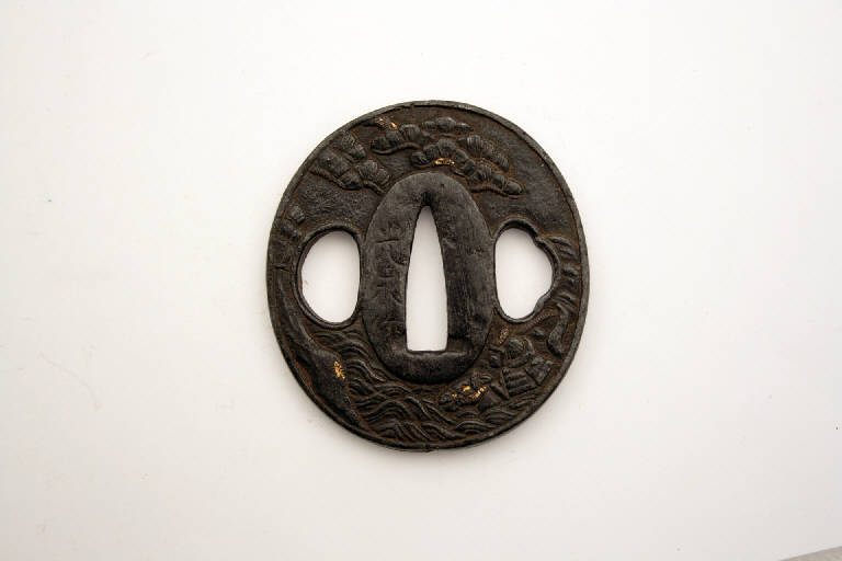 - NOTIZIE STORICO CRITICHE In Giappone l'elsa è detta "tsuba". La sua funzione primaria è quella di fare in modo che la mano di chi impugna la spada non finisca sulla propria lama, oltre a bilanciare la spada e a proteggere la mano dalla lama dell'avversario.\nIndirettamente, gli tsuba servivano anche a mostrare lo stato sociale e il gusto personale e, come per altri oggetti d'uso, divennero presto un mezzo d'espressione artistica.\nDal XIX secolo, quando la spada e i suoi accessori divennero più decorativi che funzionali, e ancor più dal 1878, a seguito della proibizione di portare la spada, gli tsuba erano prodotti come oggetti da collezione favoriti dagli occidentali, che li vedevano come una originale e nuova forma d'arte. Molti di questi oggetti raggiunsero infatti l'Europa già nell'Ottocento.\n\nQuella del pino è una immagine molto comune nell'arte giapponese. La sua simbologia ha derivazione cinese. Essendo una pianta sempreverde il pino è infatti associato alla longevità e al buon augurio. Esso è inoltre simbolo dell'inverno e del Nuovo Anno. Ad esso sono inoltre legate innumerevoli leggende del folclore.\n\nSI tratta forse di una scena del romanzo epico medievale Storia degli Heike (Heike monogatari), dove Taira no Atsumori si lancia in mare con il cavallo per cercare rifugio sulla flotta, per poi ritornare alla riva, richiamato dalla sfida col campione degli avversari del clan Minamoto.