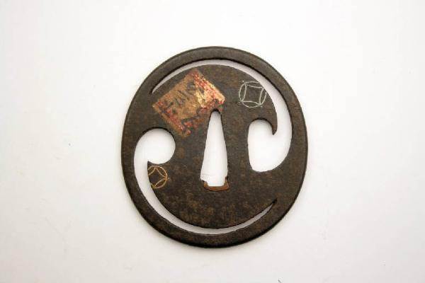 Elsa di spada giapponese di forma ovale. Il traforo (sukashi) è a motivo di tomoe, una forma astratta che assomiglia a una virgola. La decorazione, a motivo cerchi intersecantisi "a moneta", è realizzata ad agemina d'oro e d'argento. Attorno al foro centrale per il passaggio del codolo (nakagoana) i due fori laterali (hitsuana) sono ricavati dal disegno del traforo.
