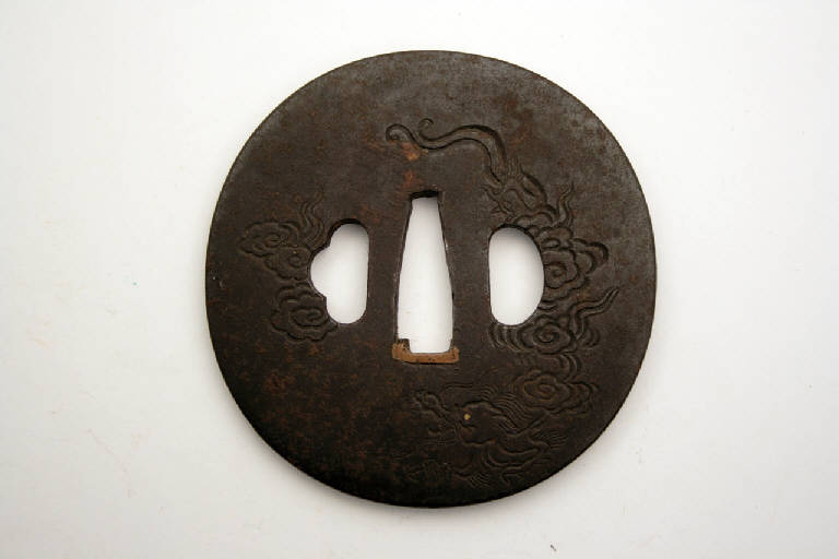 - NOTIZIE STORICO CRITICHE In Giappone l'elsa è detta "tsuba". La sua funzione primaria è quella di fare in modo che la mano di chi impugna la spada non finisca sulla propria lama, oltre a bilanciare la spada e a proteggere la mano dalla lama dell'avversario.\nIndirettamente, gli tsuba servivano anche a mostrare lo stato sociale e il gusto personale e, come per altri oggetti d'uso, divennero presto un mezzo d'espressione artistica.\nDal XIX secolo, quando la spada e i suoi accessori divennero più decorativi che funzionali, e ancor più dal 1878, a seguito della proibizione di portare la spada, gli tsuba erano prodotti come oggetti da collezione favoriti dagli occidentali, che li vedevano come una originale e nuova forma d'arte. Molti di questi oggetti raggiunsero infatti l'Europa già nell'Ottocento.\n\nAnche in Giappone, come in Cina, il drago è uno dei soggetti artistici più rappresentati. La figura del drago permea infatti le religioni, il folclore, l'arte e la cultura in generale dei paesi dell'Asia Orientale che hanno avuto la Cina come riferimento culturale. La sua simbologia, è perciò complessa e i significati ad essa legata sono molteplici, ma sempre positivi. In particolare il drago è portatore di ricchezza e fortuna ed è associato all'acqua in quanto abitante dei mari e dei cieli. Secondo la tradizione cinese, infatti, il drago, inseguendo la perla (il tuono) fra le nuvole causa le piogge, necessarie al buon raccolto.\n\nUno spessore di rame è stato applicato all'interno del foro centrale per fermare perfettamente l'elsa sulla lama.