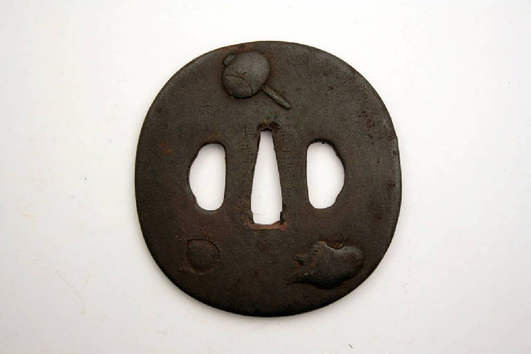 Elsa di spada giapponese di forma ovale, con bordo leggermente rialzato rispetto al centro, con i tre fori canonici, quello centrale (nakagoana) per il codolo, il foro di sinistra (kozuka hitsuana) per il coltellino, e quello di destra (kogai hitsuana) per lo spillone. La decorazione rappresentata mostra il martello di Daikoku, assieme ad altri simboli del buddismo come la perla fiammeggiante, ed è realizzata a rilievo, con pochi intarsi in argento, su una superficie porosa.
