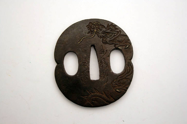 - NOTIZIE STORICO CRITICHE In Giappone l'elsa è detta "tsuba". La sua funzione primaria è quella di fare in modo che la mano di chi impugna la spada non finisca sulla propria lama, oltre a bilanciare la spada e a proteggere la mano dalla lama dell'avversario.\nIndirettamente, gli tsuba servivano anche a mostrare lo stato sociale e il gusto personale e, come per altri oggetti d'uso, divennero presto un mezzo d'espressione artistica.\nDal XIX secolo, quando la spada e i suoi accessori divennero più decorativi che funzionali, e ancor più dal 1878, a seguito della proibizione di portare la spada, gli tsuba erano prodotti come oggetti da collezione favoriti dagli occidentali, che li vedevano come una originale e nuova forma d'arte. Molti di questi oggetti raggiunsero infatti l'Europa già nell'Ottocento.\n\nAnche in Giappone, come in Cina, il drago è uno dei soggetti artistici più rappresentati. La figura del drago permea infatti le religioni, il folclore, l'arte e la cultura in generale dei paesi dell'Asia Orientale che hanno avuto la Cina come riferimento culturale. La sua simbologia, è perciò complessa e i significati ad essa legata sono molteplici, ma sempre positivi. In particolare il drago è portatore di ricchezza e fortuna ed è associato all'acqua in quanto abitante dei mari e dei cieli. Secondo la tradizione cinese, infatti, il drago, inseguendo la perla (il tuono) fra le nuvole causa le piogge, necessarie al buon raccolto.