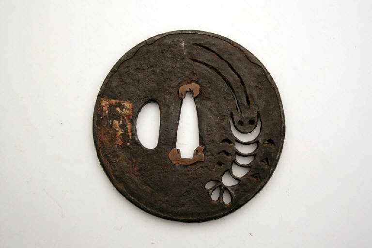 - NOTIZIE STORICO CRITICHE In Giappone l'elsa è detta "tsuba". La sua funzione primaria è quella di fare in modo che la mano di chi impugna la spada non finisca sulla propria lama, oltre a bilanciare la spada e a proteggere la mano dalla lama dell'avversario.\nIndirettamente, gli tsuba servivano anche a mostrare lo stato sociale e il gusto personale e, come per altri oggetti d'uso, divennero presto un mezzo d'espressione artistica.\nDal XIX secolo, quando la spada e i suoi accessori divennero più decorativi che funzionali, e ancor più dal 1878, a seguito della proibizione di portare la spada, gli tsuba erano prodotti come oggetti da collezione favoriti dagli occidentali, che li vedevano come una originale e nuova forma d'arte. Molti di questi oggetti raggiunsero infatti l'Europa già nell'Ottocento.\n\nDegli spessori di rame sono stati applicati ai vertici del nakagoana per fermare perfettamente l'elsa sulla lama.\n\nLe tsuba ko-katchushi venivano realizzate da fabbri di aramature.\nIl crostaceo è simbolo di longevità.