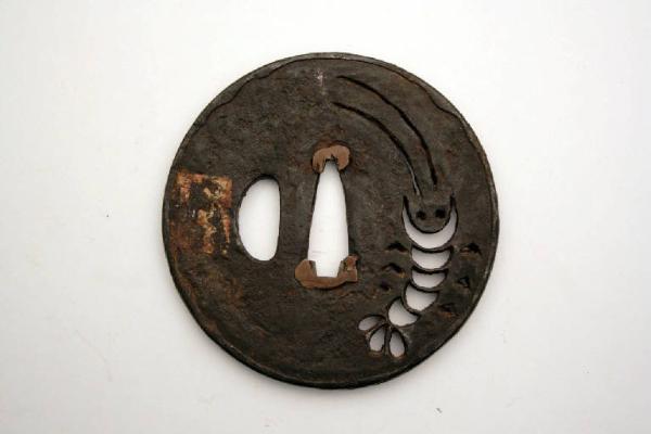 Elsa di spada giapponese di forma tonda, con bordo ripiegato sulla superficie. Sono presenti il foro centrale per il codolo (nakagoana) e il foro di sinistra (kozuka hitsuana). \nLa decorazione, realizzata con la tecnica a traforo, sukashi, raffigura in negativo un gambero. La superficie è martellata e il bordo è inciso a segmenti obliqui.