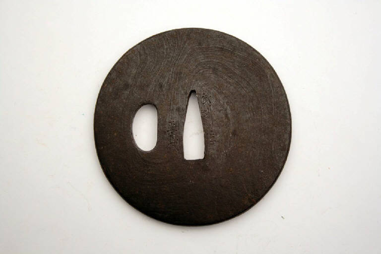Elsa di spada giapponese di forma tonda. Sono presenti il foro centrale per il codolo (nakagoana) e il foro di sinistra (kozuka hitsuana). La superficie è stata forgiata a motivo di venature del legno (mokumeji).