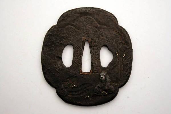 Elsa di spada giapponese di forma quadrilobata (mokko), con bordo irregolare e rialzato, con i tre fori canonici, quello centrale (nakagoana) per il codolo, il foro di sinistra (kozuka hitsuana) per il coltellino, e quello di destra (kogai hitsuana) per lo spillone. La decorazione è realizzata con intarsi in oro e argento e raffigura un anziano uomo nei pressi di una riva.