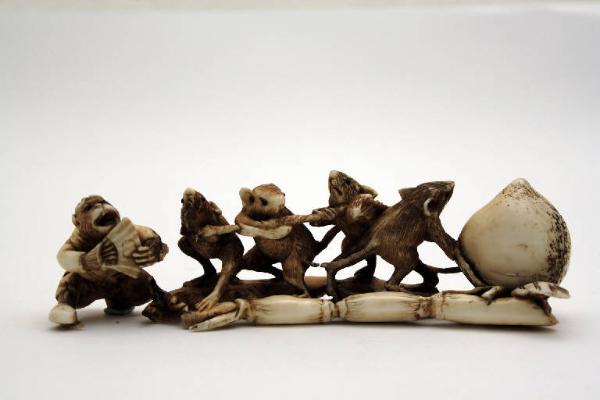 Statuetta, okimono (letteralmente: oggetto da posare), in avorio, raffigurante una scimmia in abiti umani, con un ventaglio in mano, che impartisce il tempo a quattro topolini intenti a tirare tutti assieme la corda alla quale hanno legato la pesca che stanno trascinando su due binari di radici di loto. Tutto l'oggetto è patinato in modo da creare ombreggiature ed evidenziare alcuni particolari incisi come il pelo.
