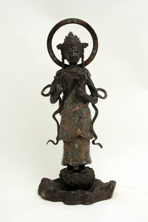 Statua in bronzo decorato a smalti champlevé raffigurante il bodhisattva Kannon (Avalokitesvara) stante su un fiore di loto, tipicamente ingioiellato e incoronato. La mano sinistra regge un fiore di loto (parzialmente mancante).