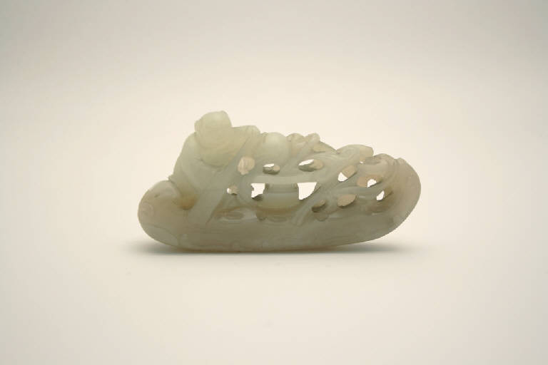 Piccola scultura in nefrite di colore verde chiaro con venature arancioni raffigurante un bambino che rema su una giunca sulla quale è posato un vaso dal quale esce una pianta dell'immortalità (lingzhi). Il fondo della giunca è tutto inciso a disegno di flutti. L'artista è riuscito ad approfittare delle diverse sfumature della giada, evidenziando l'imbarcazione.