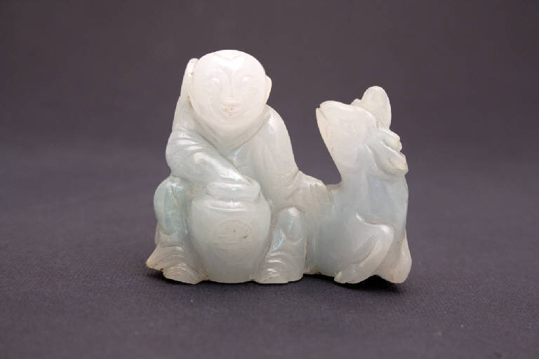 Scultura in giada verde (giadeite???) raffigurante un bambino seduto con una giara fra le gambe e l'animale mitico qilin accucciato vicino a lui. Sulla giada è inciso un medaglione con disegnato il carattere stilizzato "shou" (longevità).