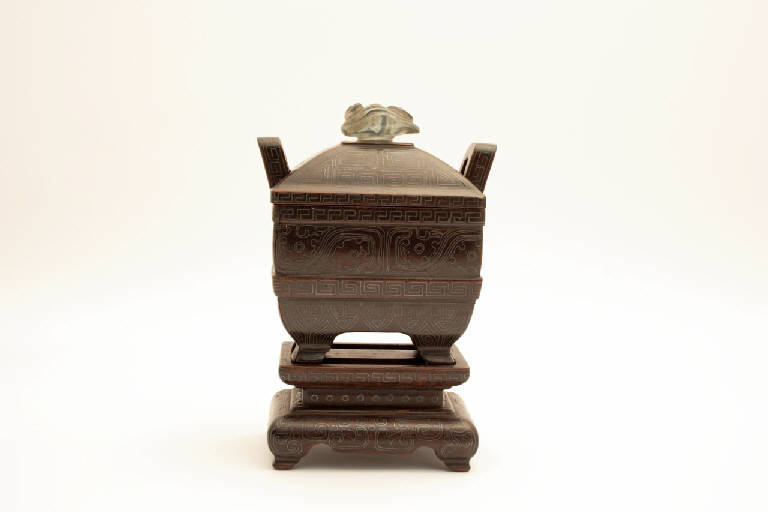 Contenitore di legno a forma di bronzo cerimoniale arcaico (ding) a pianta rettangolare con quattro piedini e due anse a ponte, sormontato da un coperchio a cupola con pomolo in cristallo di rocca a forma di fungo lingzhi. All'interno del corpo principale si incastra un recipiente in rame con decoro inciso a meandri, con bocca tonda e stretta. L'incensiere poggia su una base rettangolare a forma di tavolino da studio. Tutto l'oggetto è decorato a intarsio di filo d'argento con greche di vario tipo, palmette e motivi stilizzati che alludono a forme zoomorfe derivanti da stilemi arcaici.