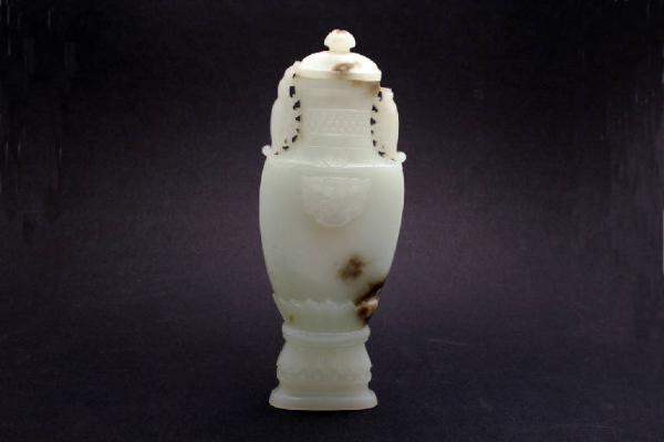 Vasetto con coperchio, in giada verde con sfumature bianche e marroni, raffigurato inserito su un piedistallo a forma di doppia corolla di petali di loto. Presenta un piede scalonato a pianta quadrata e un corpo alto, con pareti piane, terminanti a spalla squadrata e collo a tromba decorato con anse floreali traforate. Il coperchio mostra una scheggiatra intarsiata con una pietra rossa. La decorazione incisa al centro della pancia raffigura un mascherone zoomorfo, mentre sulla spalla si trova il simbolo circolare del Tao e il collo è interessanto da una fascia centrale a cerchietti.