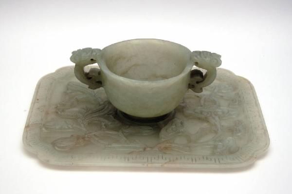 Coppa e piattino in nefrite verde chiaro con venature marroni. La coppa presenta un basso piede circolare, parete alta terminante in un orlo leggermente everso, con due anse semicircolari sagomate a forma di drago stilizzato il cui corpo si piega dal centro della parete fino a mordere il bordo. Il piatto è rettangolare con gli angoli smussati e presenta una decorazione intagliata a bassorilievo raffigurante un intreccio di piante dell'immortalità (linghzhi), il simbolo del Tao, e svastiche buddiste.