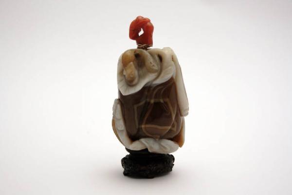Boccetta da fiuto in pietra dura con tappo in corallo rosso al quale è attaccato un cucchiaino in avorio. Nell'intaglio sono raffigurati un fungo e un pipistrello. Basetta in legno sagomata e decorata a traforo a motivo di nuvole.