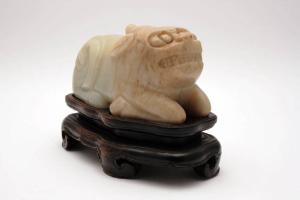 Scultura in nefrite con venature giallastre e verdi raffigurante l'animale mitologico qilin in posizione seduta, le zampe sotto al ventre e lo sguardo alzato, con le fauci in vista. Il qilin è una combinazione di animali reali e fantastici. Nella versione più comune si presenta con corpo di cervo, con scaglie di pesce, zampe ungulate e testa di drago bicorne o, altrimenti, con testa leonina bicorne o a unicorno. In questo caso l'animale presenta una testa leonina con unicorno, è privo di scaglie evidenti e presenta linee squadrate ed essenziali. L'oggetto posa su una base sagomata e intagliata in legno.