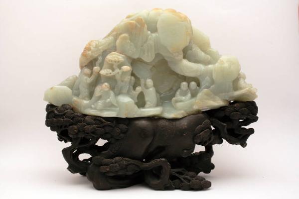 Montagna da tavolo in nefrite verde chiaro con sfumature arancioni, poggiante su una base in legno traforato a forma di alberi di pino. La pietra è incisa a forma di paesaggio montano con alberi e sei figure raffiguranti dei monaci.