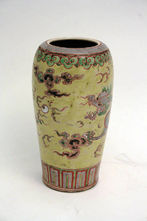 - NOTIZIE STORICO CRITICHE La produzione di porcellana completamente ricoperta da invetriatura e smalti sopravetrina a bassa cottura è tipica della metà del periodo Qing, ma se si eccettuano le produzioni più raffinate per la corte, soprattutto a partire dal periodo di regno di Daoguang (1821-1850), a causa di un generale abbassamento della qualità della porcellana, l'uso di ricoprire totalmente il corpo ceramico era spesso un espediente per rimediare ai difetti, nascondendoli con smalti spessi e coprenti. In questo caso, la tavolozza utilizzata è quella della famiglia verde, ma lo stile non appartiene ad alcuna produzione tradizionale, per cui il vaso è da ricondursi con ogni probabilità a fornaci private del periodo della Repubblica.\n\nLa figura del drago permea le religioni, l'arte, il folclore, e la cultura in generale della Cina e dei paesi dell'Asia Orientale che hanno avuto la Cina come riferimento culturale. La sua simbologia, è perciò complessa e i significati ad essa legata sono molteplici. Si tratta sempre di un simbolo positivo che viene associato ad esempio all'Imperatore e al punto cardinale dell'est, da cui sorge il sole. Inoltre, il drago, inseguendo la perla (il tuono) fra le nuvole, causa le piogge necessarie al buon raccolto.