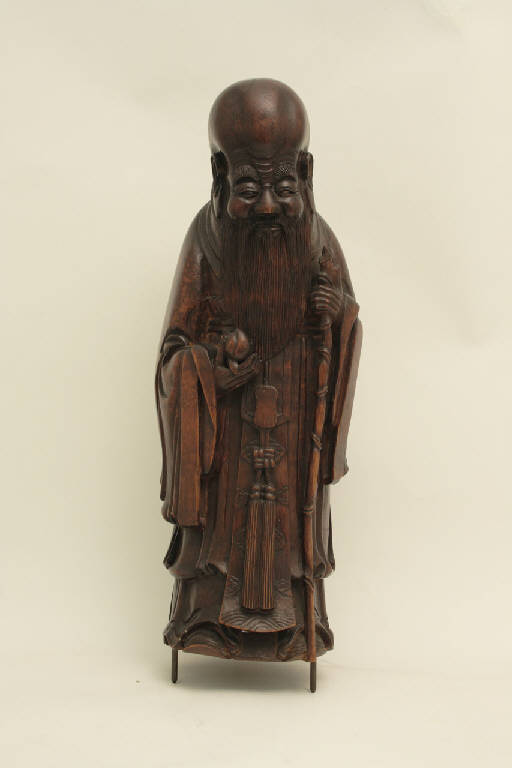 Scultura in bambù di Shoulao, la divinità taoista della longevità, raffigurato tipicamente come un uomo anziano dalla lunga barba, la testa allungata, quasi fallica, un bastone nella mano destra e la pesca dell'immortalità nella mano sinistra. Dalla base spuntano tre chiodi che servivano a fissare la scultura a una base, dispersa.