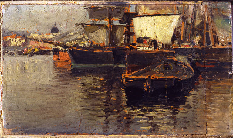 Dipinto a olio di piccole dimensioni di Attilio Pratella, montato in una cornice con soggetti analoghi, raffigurante alcune barche nel porto di Napoli.
