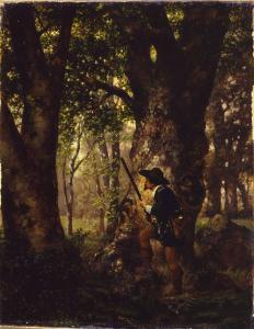 Dipinto a olio di piccole dimensioni di Joszef Schmidt, raffigurante un cacciatore con fucile e cane tra gli alberi di un bosco.
