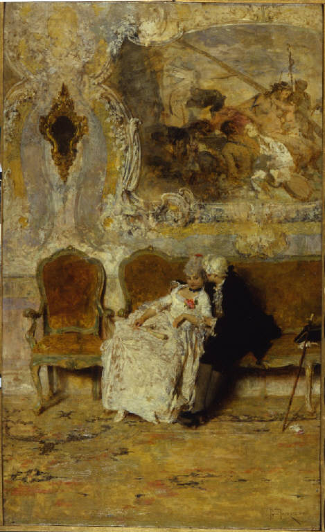 Dipinto a olio di medie dimensioni di Giacomo Favretto, raffigurante un uomo e una donna in abiti settecenteschi, seduti su un divano in un interno decorato in stile rococò.