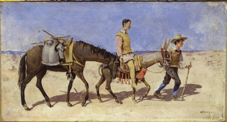 Dipinto a olio di piccole dimensioni di Enrique Atalaya, raffigurante Don Chisciotte su un asino, condotto a mano da Sancho Panza, seguiti da un cavallo che porta i pezzi di un'armatura.