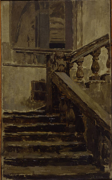 Dipinto di piccole dimensioni di Gioachino Toma, raffigurante parte di una scalinata a doppia rampa, che sale verso destra.