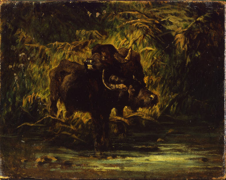 Dipinto a olio di piccole dimensioni, di Giuseppe Raggio, raffigurante due bufali presso un corso d'acqua.