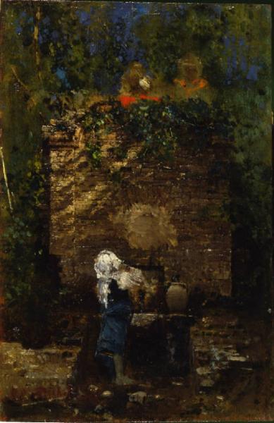 Dipinto a olio di piccole dimensioni di Francesco Paolo Michetti, raffigurante una ragazzina con gonna blu e velo bianco a figura intera, di spalle, presso una fontana in mattoni.