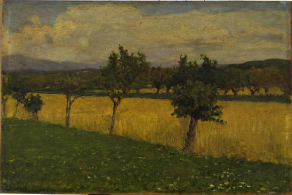 Dipinto a olio di piccole dimensioni di Clemente Pugliese Levi, raffigurante un paesaggio pianeggiante, con distese erbose alternate a distese gialle, scandite da filari di alberi.
