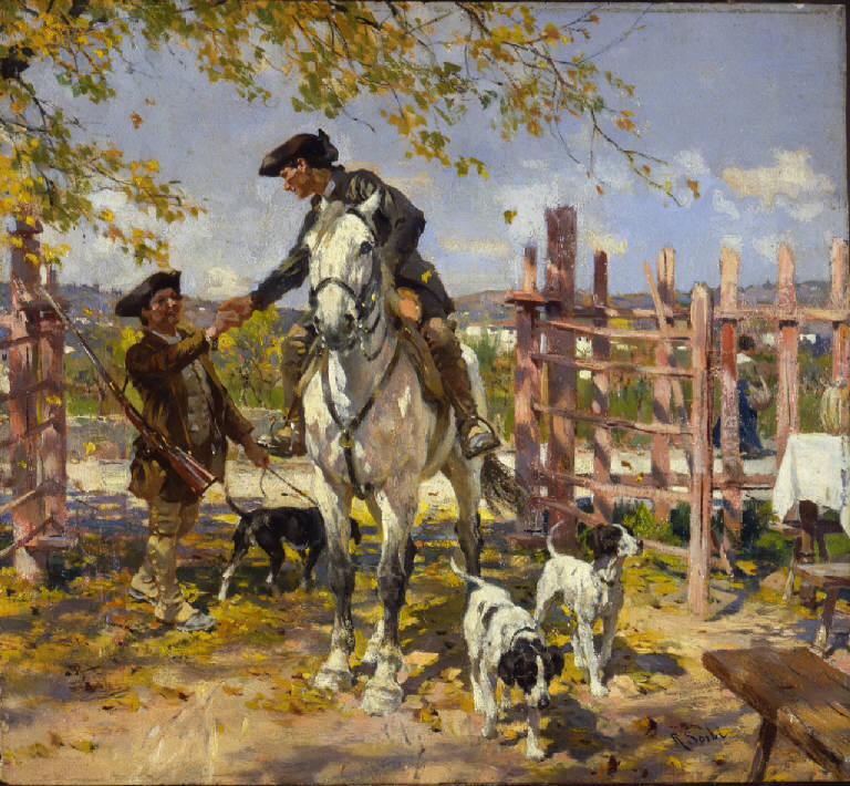 Dipinto a olio di medie dimensioni di Raffaello Sorbi, raffigurante un uomo a cavallo che stringe la mano a un uomo in piedi con fucile, entrambi in abiti settecenteschi, all'ingresso di un recinto all'aperto, accompagnati da tre cani.