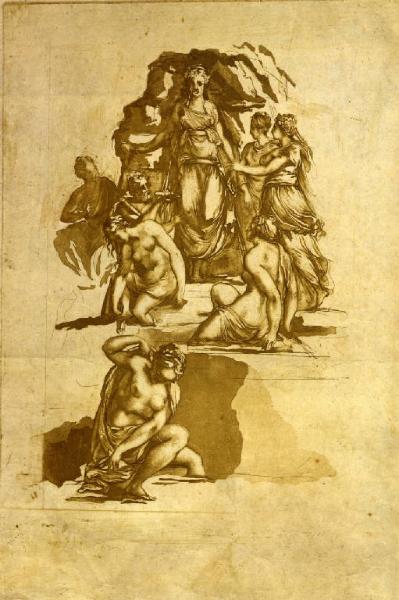 Disegno su carta, raffigurante una figura femminile piangente panneggiata, circondata da figure maschili e famminili seminude.