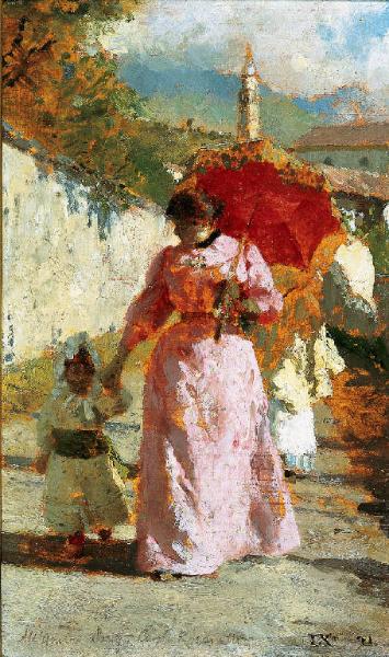 Dipinto a olio di piccole dimensioni di Luigi Nono, raffigurante una donna in abito rosa con parasole rosso che conduce per mano una bambina lungo la strada di un paese.