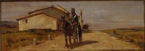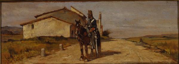 Dipinto a olio di piccole dimensioni di Giovanni Fattori, raffigurante un soldato a cavallo fermo al centro di una strada di campagna, costeggiata da un casolare.