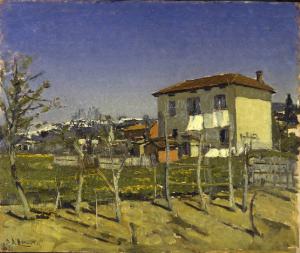 Dipinto a olio di medie dimensioni di Domenico de Bernardi, raffigurante un paesaggio con alcuni alberi in primo piano, una casa gialla a due piani con i panni stesi alle finestre, sulla destra e montagne sullo sfondo.