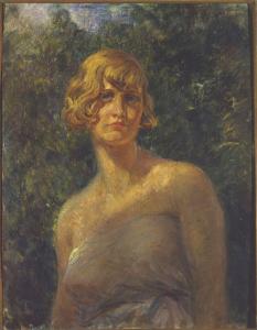 Dipinto a olio di medie dimensioni di Aldo Mazza, raffigurante una donna bionda a mezzobusto, forse la moglie del pittore, con un vestito scollato lila, rivolta frontalmente verso il riguardante.