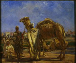 Dipinto a olio di medie dimensioni di Aldo Mazza, raffigurante tre uomini con un dromedario, rivolto di profilo verso sinistra; in secondo piano un altro dromedario è seduto per terra; sulla sfondo la città di Tripoli.