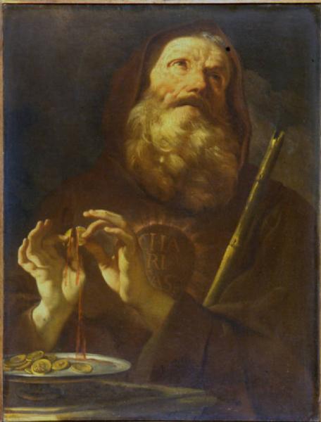 Dipinto a olio di medie dimensioni, raffigurante un monaco a mezzobusto con saio marrone, con il viso rivolto verso destra.