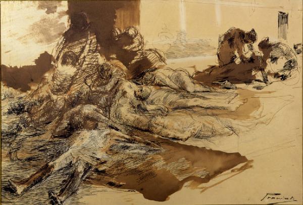 Disegno a inchiostro di piccole dimensioni di Gaetano Previati, raffigurante un episodio dei Promessi Sposi di Manzoni: figure appena sbozzate di appestati stesi a terra.