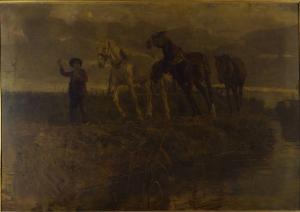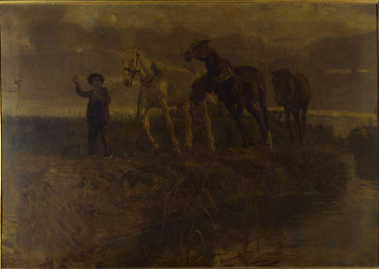 Dipinto a olio di grandi dimensioni di Ettore Tito, raffigurante tre cavalli, uno bianco e due marroni, che trainano una barca, parzialmente visibile sulla destra, guidati da un uomo, da destra verso sinistra.