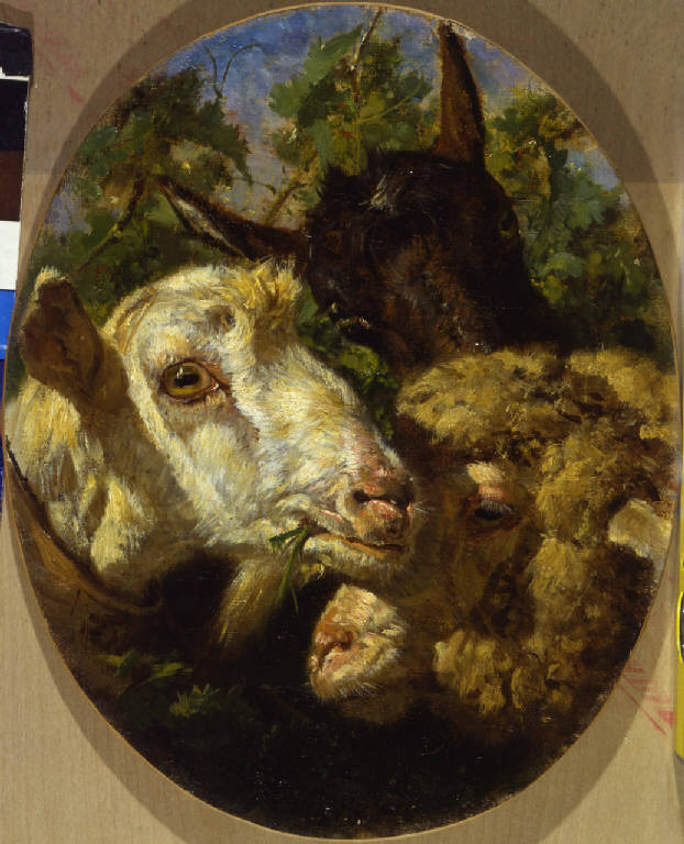 Dipinto a olio di piccole dimensioni ovale di Filippo Palizzi, raffigurante la testa di una capra, di una pecora e di un asino, tra foglie.